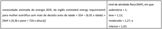 Determinar a necessidade de energia necessária para manutenção das funções metabólicas é objeto de estudo desde a antiguidade. O objetivo dos estudos era estabelecer de forma mais precisa o gasto energético basal para promover equilíbrio entre o gasto metabólico e o consumo energético, garantindo assim a homeostase corporal. Conhecer o gasto energético do indivíduo permite que se desenvolva um plano alimentar adequado as suas necessidades. Nesse contexto, considere o caso hipotético: Carla é uma mulher de 35 anos de idade que mede 1,65 m e pesa 60 kg, pratica atividade física leve (média 1h/dia - 2 a 3x/semana), utilizando a fórmula para cálculo da necessidade energética diária dessa mulher (EER)).